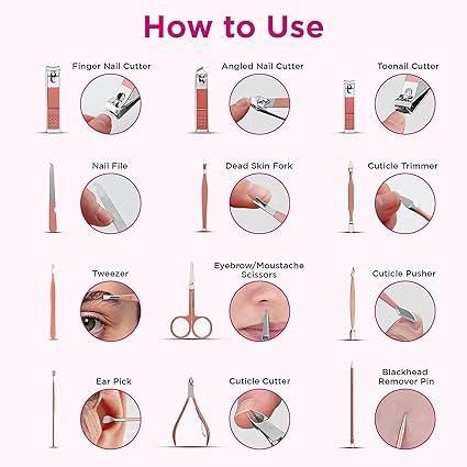 Complete Nail Care Kit: 18 essential tools including nail clippers, cuticle trimmers, files, and more.